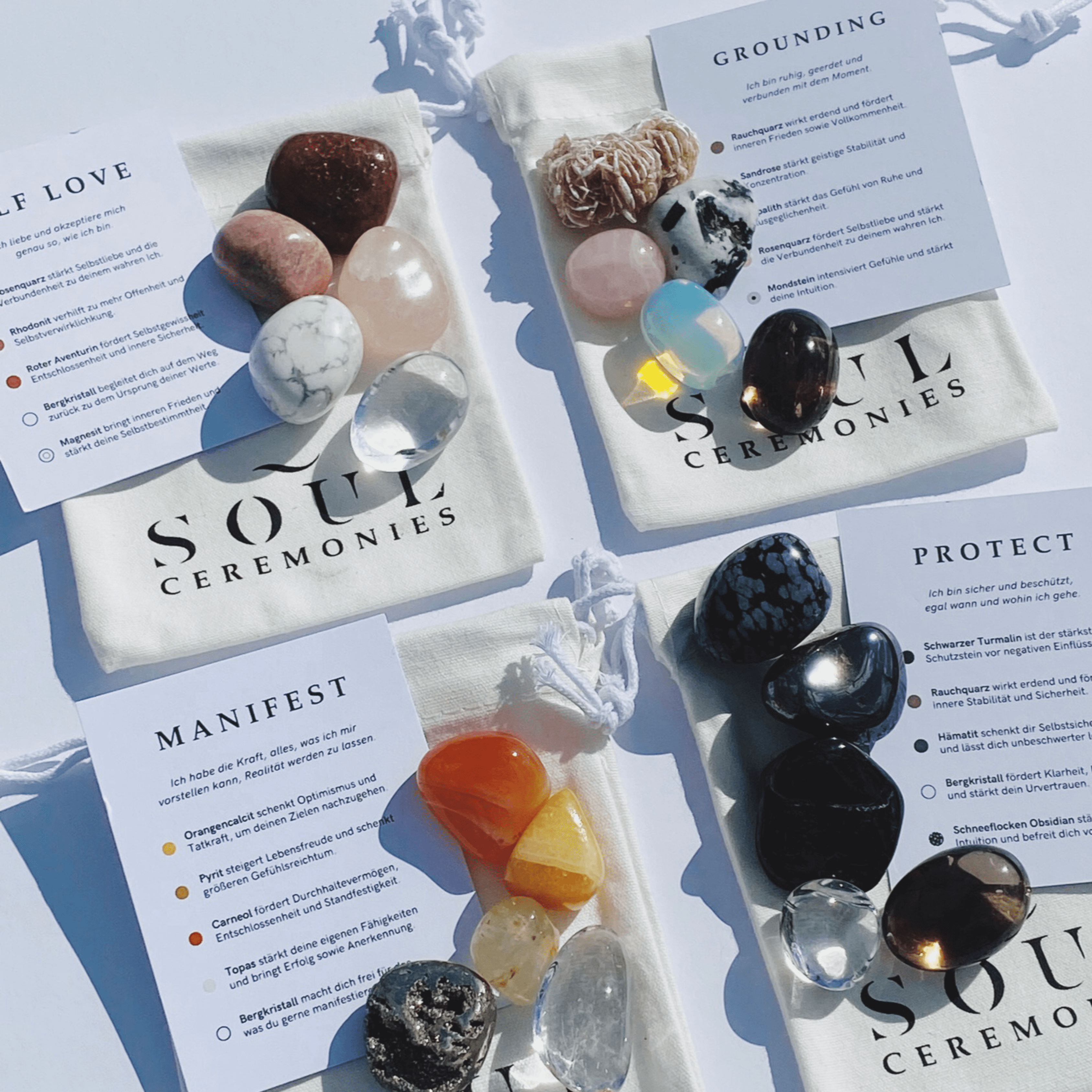 Manifestation Heilsteine-Kit im Baumwollsäckchen mit 5 Trommelsteinen und Kärtchen Kärtchen mit Affirmation und Eigenschaften der Steine: Orangencalcit, Carneol, Bergkristall, Pyrit, TopasManifestation Heilsteine-Kit im Baumwollsäckchen mit 5 Trommelsteinen und Kärtchen Kärtchen mit Affirmation und Eigenschaften der Steine: Orangencalcit, Carneol, Bergkristall, Pyrit, Topas